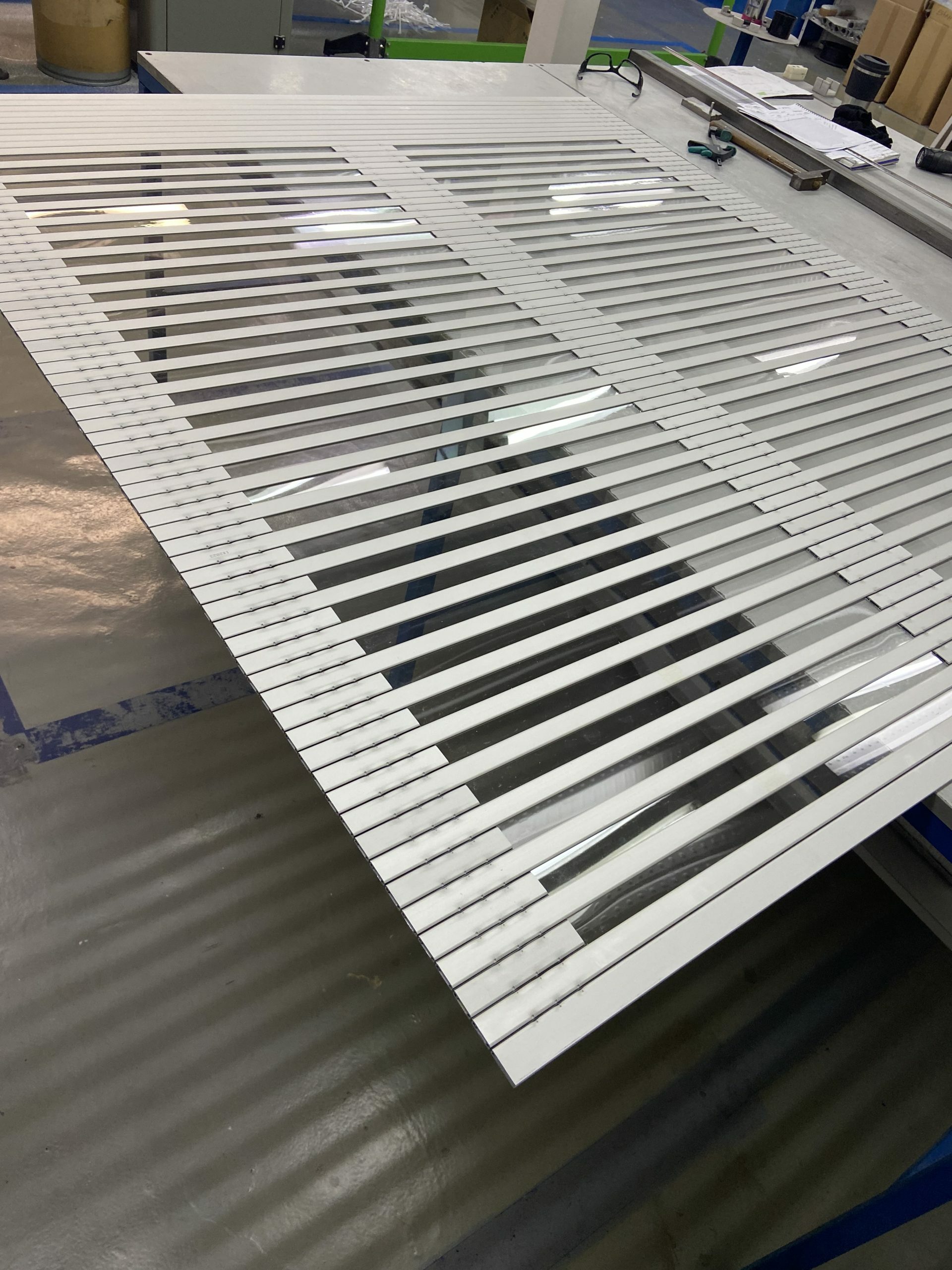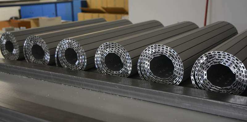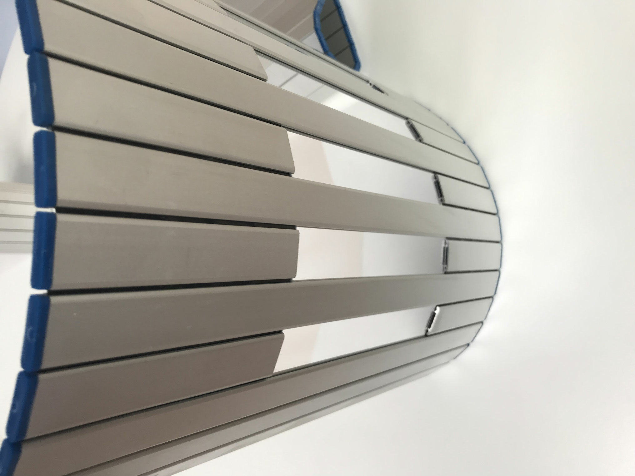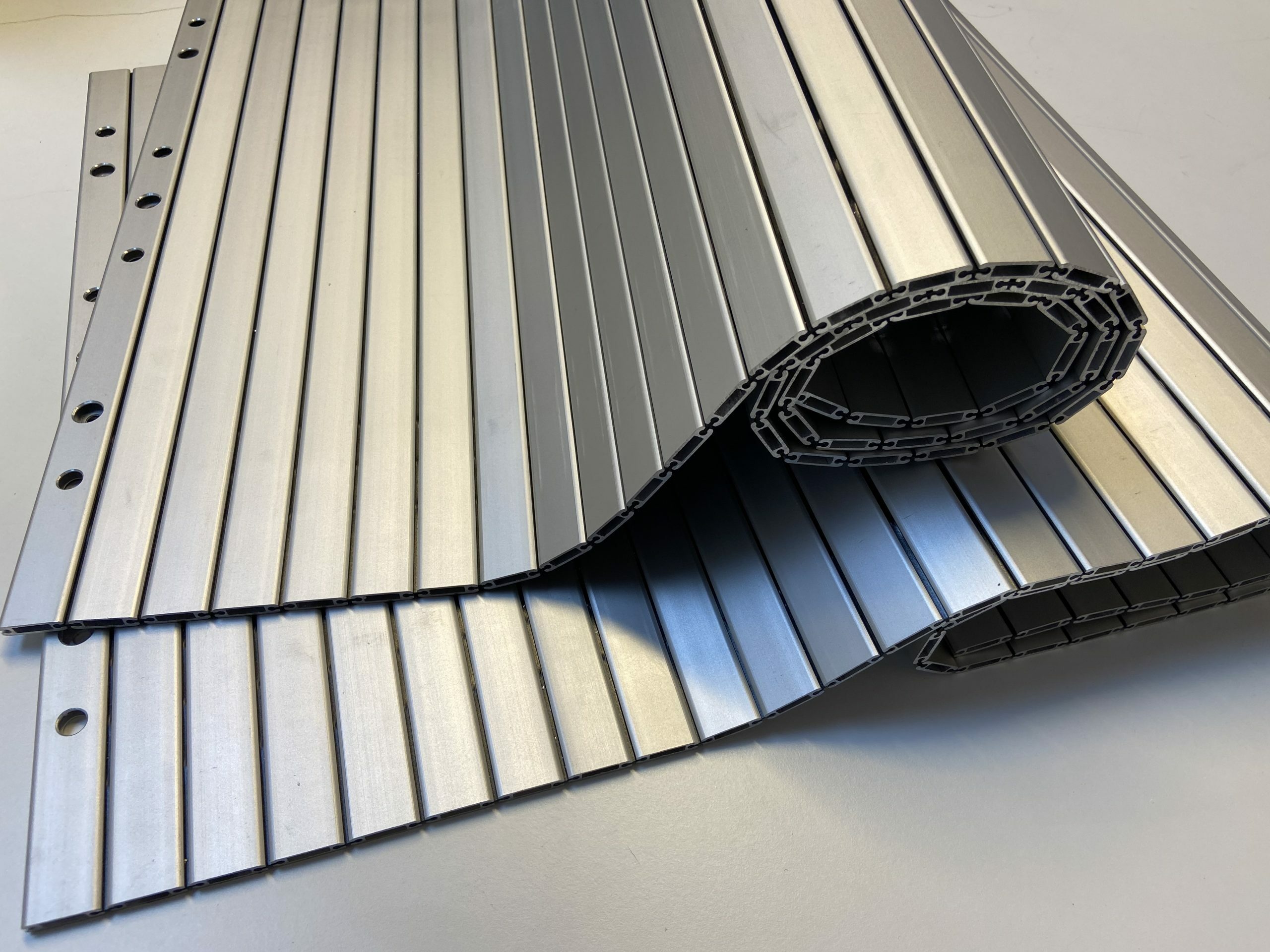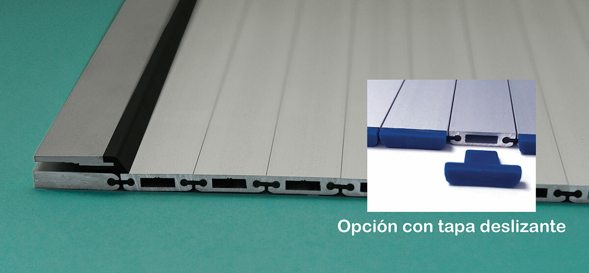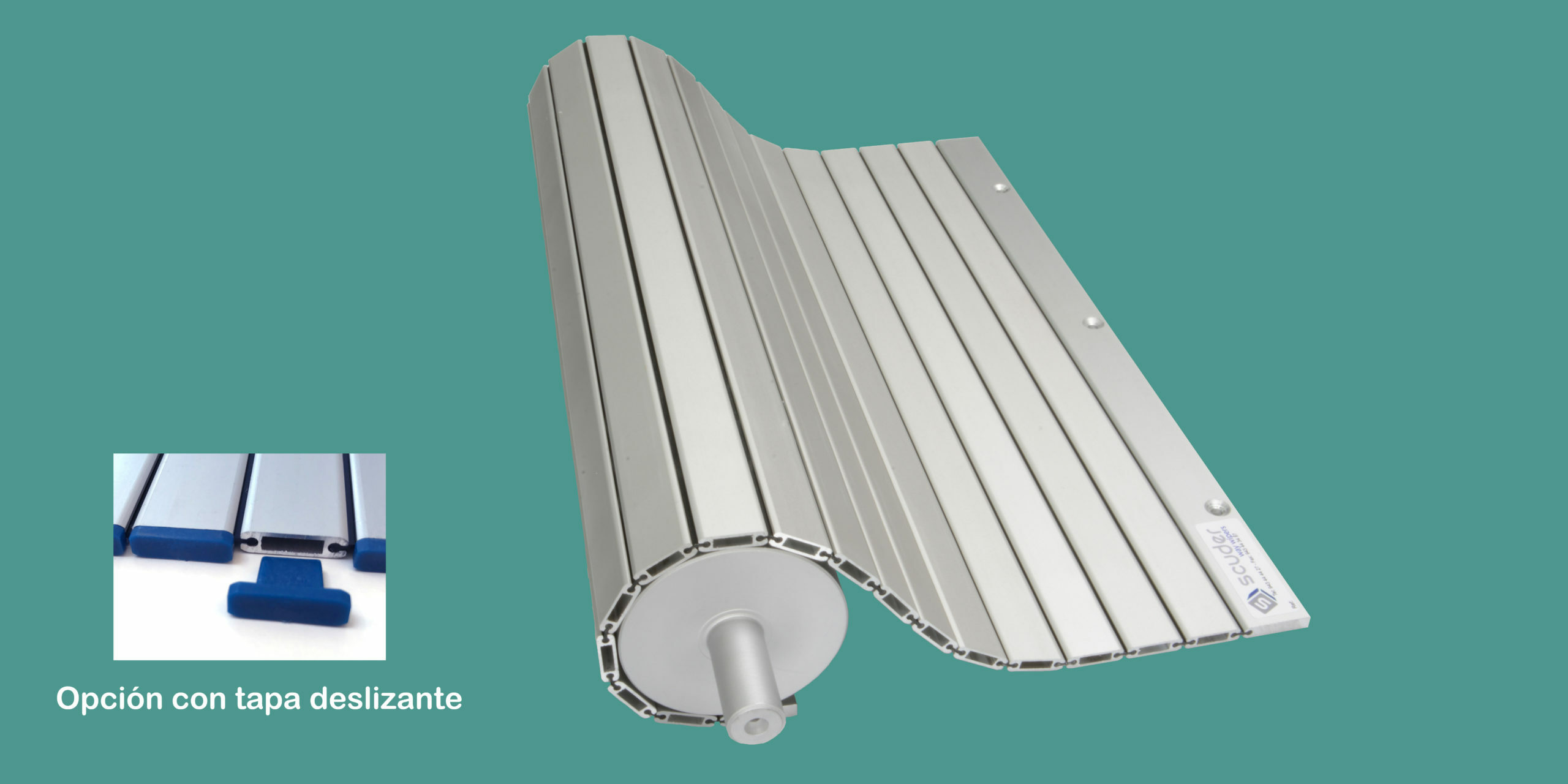 Persianas de protección para máquinas compuestas por lamas de aluminio anodizado unidas entre sí con un poliuretano especial con alta resistencia a aceites y refrigerantes. En la parte inferior se encastra la pieza de POM que, por sus propiedades, permite el deslizamiento trasversal de la persiana por la guía, sin alterar el estado de la misma. La parte superior de las persianas van reforzadas con bisagras y tornillos de unión para dar mayor rigidez a las persianas.