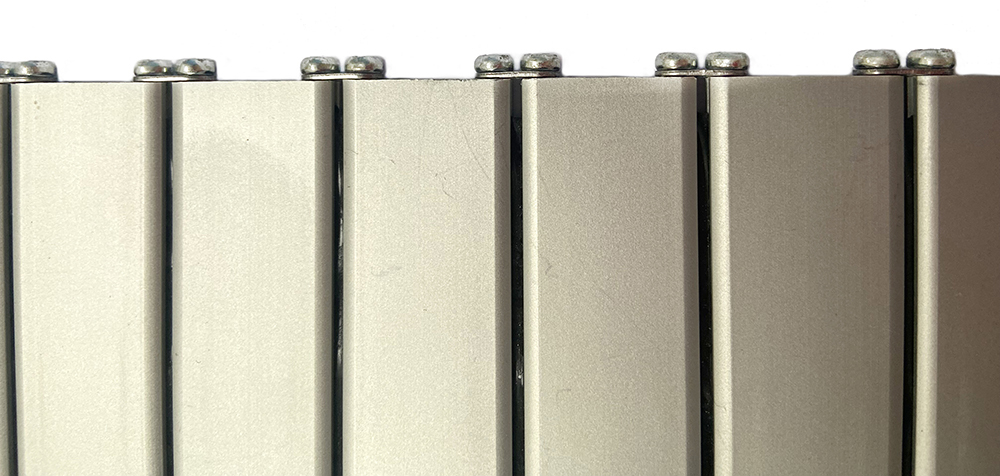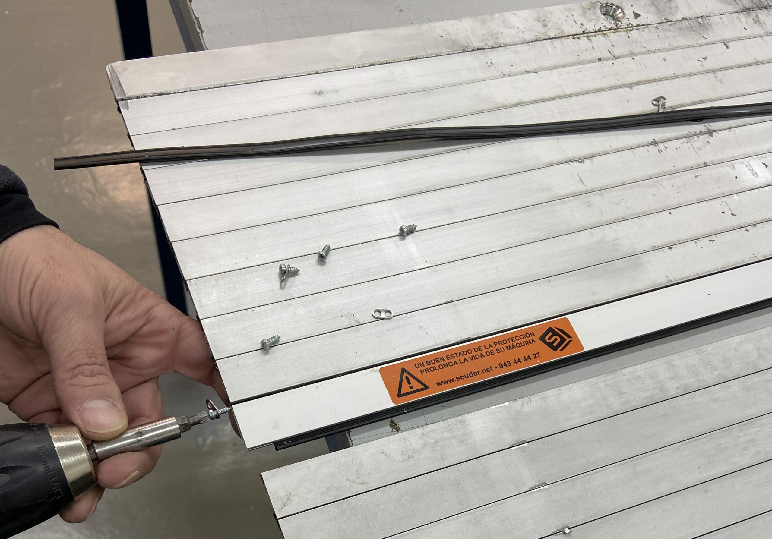 Persiana de protección para maquinaria de aluminio hueca atornillada con uniones de poliuretano y tornillos especiales. Fácil de desmontar y reparar y resistente a virutas. Anchura máxima 5.000 mm.