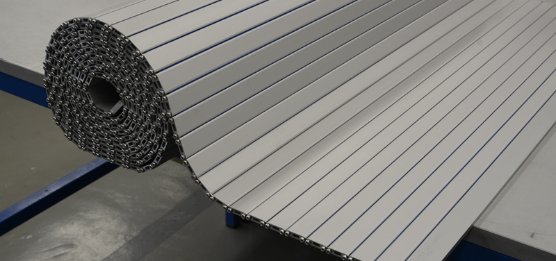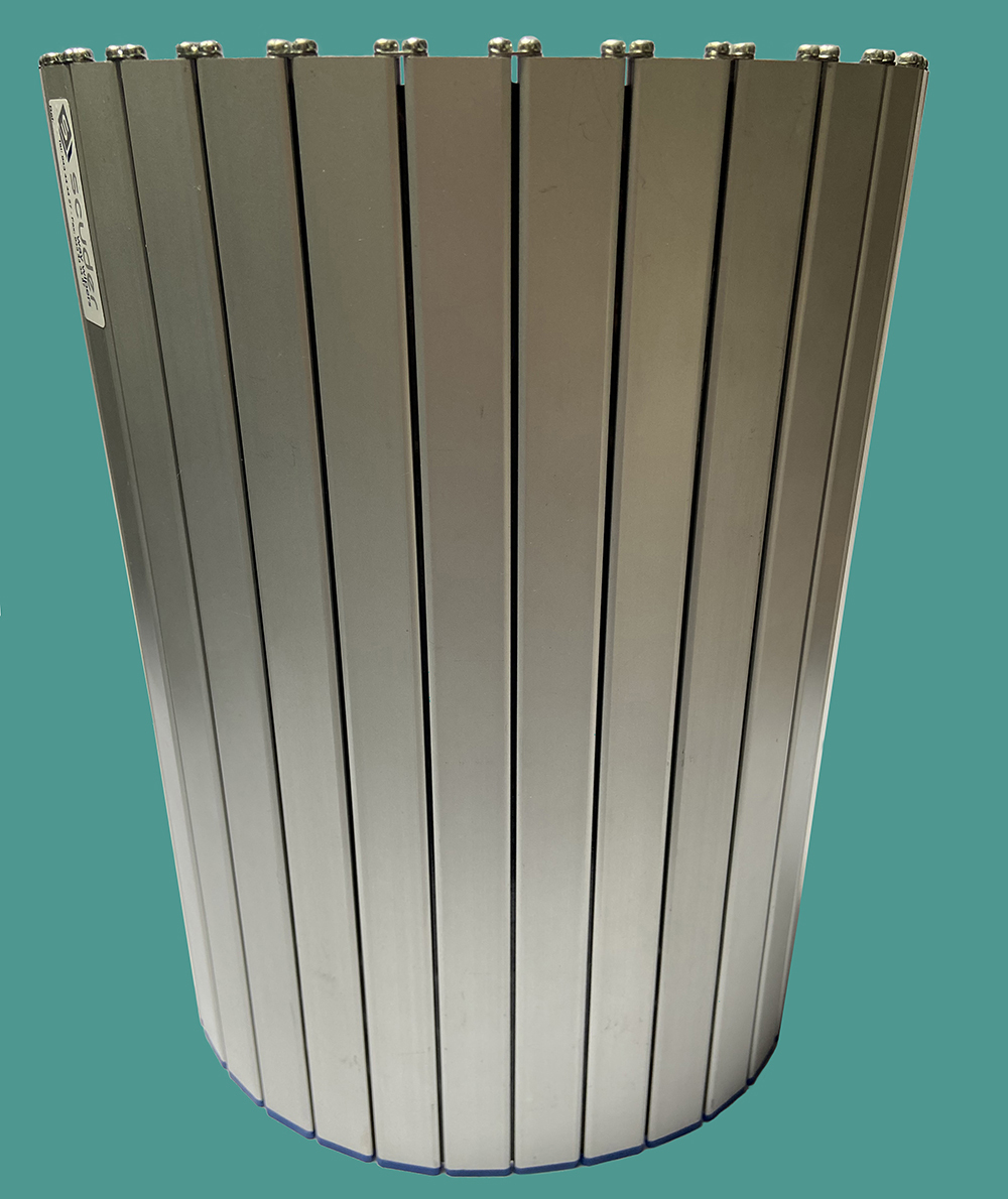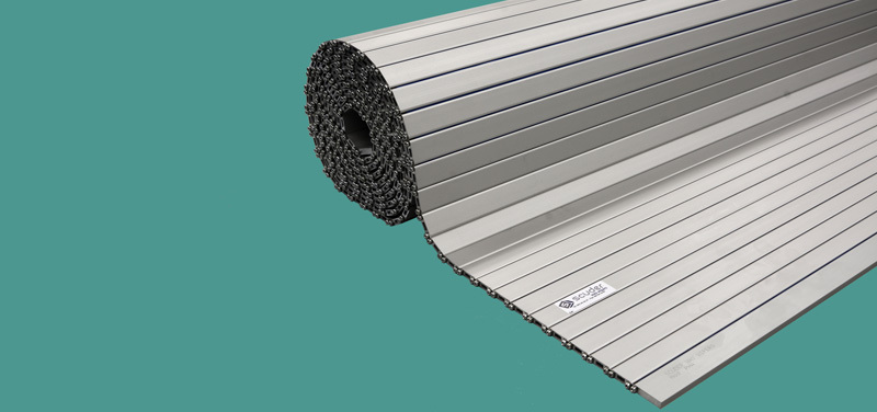 Persiana de protección para maquinaria de aluminio hueca remachada plus estanca. Con una cara plana y rígida que evita la entrada de aceites y taladrinas y con gran resistencia al impacto de virutas, con uniones de poliuretano especial. Giro a un solo lado. Anchura máxima 5.000 mm.