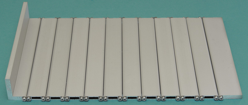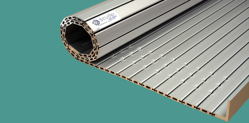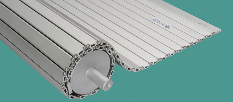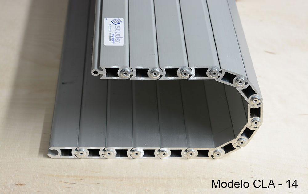Persiana de protección de aluminio para máquinas hueca atornillada con uniones de poliuretano y tornillos especiales diseñada para enrolladores. Un 30% más ligera que la PHA, pero con gran resistencia a virutas. Anchura máxima 5.000 mm. Fácil de desmontar y reparar.