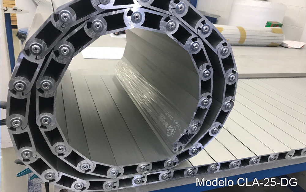 Persiana de protección para maquinaria de aluminio hueca remachada con unión de poliuretano especial. No desmontable. Máxima resistencia contra virutas.